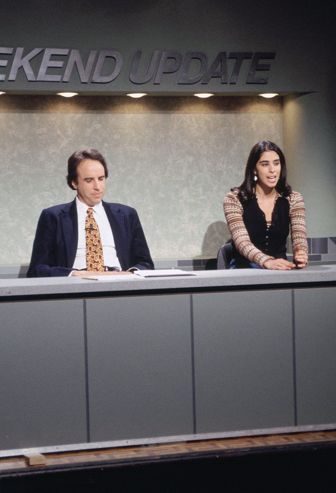 Kevin Nealon și Sarah Silverman în timpul emisiunii Weekend Update, 23 octombrie 1993.Al Levine/NBCU Photo Bank/NBCUniversal/Getty Images.