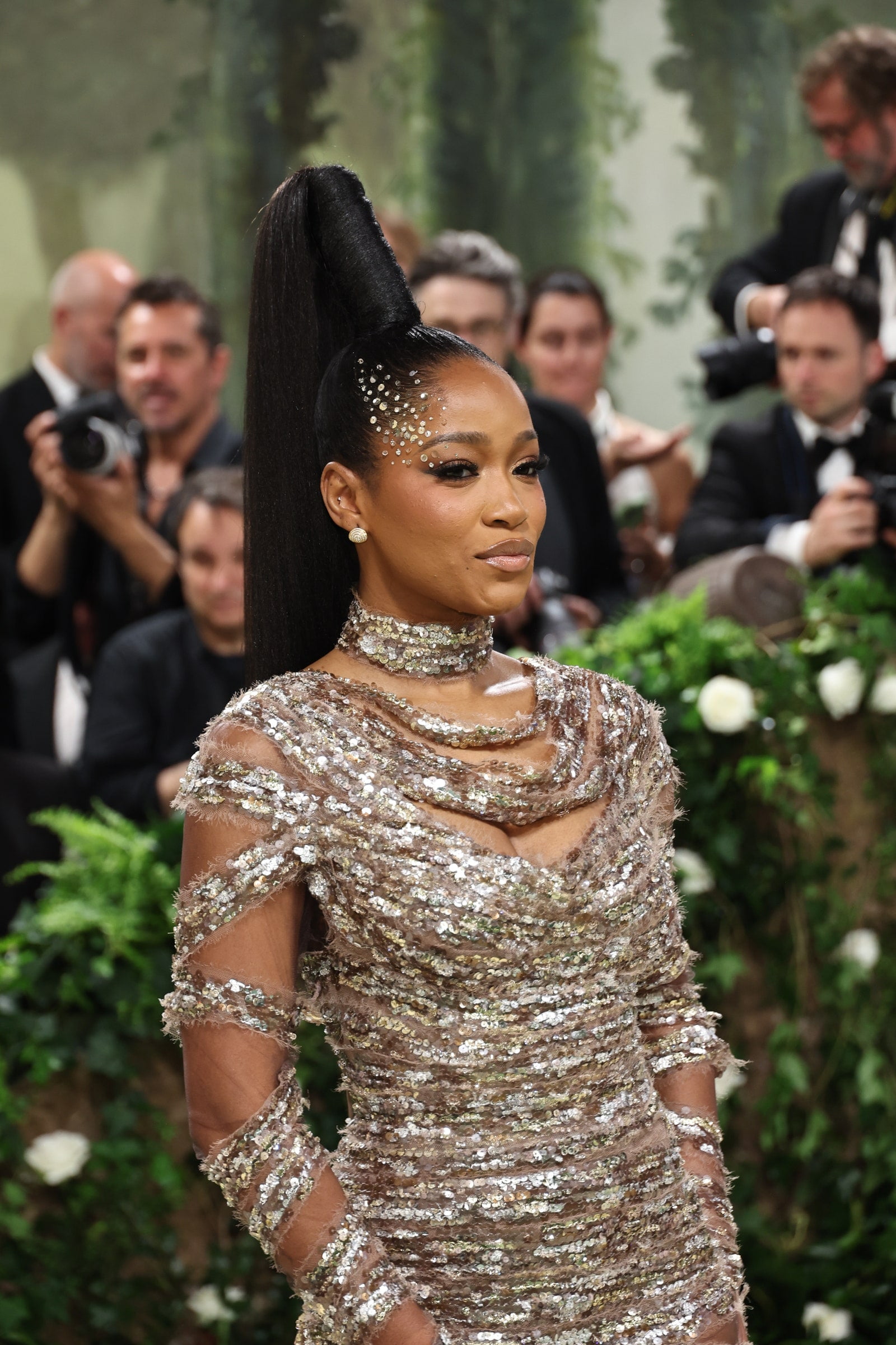 Palmer a sosit pe la Metropolitan Museum of Art literalmente drapată în paiete, care s-au înfășurat în jurul ei pentru un efect de mumie, dar mai mult decât glamour. Iar aceste paiete nu s-au limitat la rochia ei. Echipa ei glam a extins efectul strălucitor prin lipirea de paiete pe partea stângă a gâtului și pe partea dreaptă a capului: pe pleoapă, pe frunte și extinzându-se până la baza trasă cu încordare a cozii sale epice de cal.