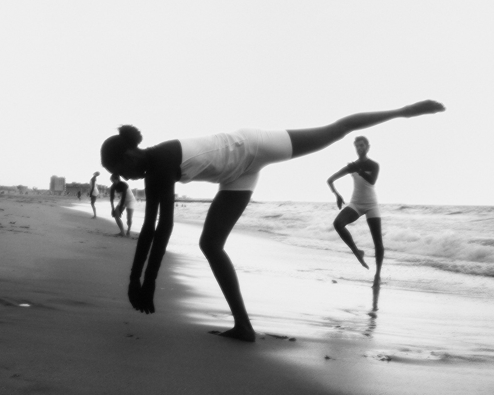Pentru Cunningham, un dansator de pionierat cu o carieră de zeci de ani, colaborarea cu alți artiști era un teritoriu familiar. John Cage, partenerul său de lungă durată, a compus frecvent muzică pentru dansuri – mișcarea care funcționează independent de sunet fiind una dintre caracteristicile coregrafului. Robert Rauschenberg, Jasper Johns și Andy Warhol au proiectat decoruri. Rei Kawakubo de la Comme des Garçons a creat un set de costume faimos de grumaz. Pentru Beach Birds, artistul Martha Skinner a supravegheat colanții și colanții alb-negru: corpuri albe cu o dungă neagră care trecea pe umeri și cobora pe fiecare braț, delimitând anvergura aripilor cu o singură linie caligrafică. Beach Sessions reia efectul – cu o schimbare de costume de baie – prin intermediul unor colanți de protecție imprimați la comandă, pantaloni scurți albi și mănuși negre. „Îmi amintesc că existau niște instrucțiuni speciale despre cum să nu-ți lași degetele să se depărteze, ci să le ții împreună, astfel încât mâna să devină o extensie”, spune fostul membru al companiei Patricia Lent, care a pus în scenă versiunea din acest weekend împreună cu o colegă de breaslă Rashaun Mitchell în numele Merce Cunningham Trust. O accidentare a împiedicat-o pe Lent să facă parte din distribuția inițială din 1991, dar s-a alăturat doi ani mai târziu pentru Elliot Caplanversiunea cinematografică a filmului, Păsări de plajă pentru cameră, care începe cu un prim-plan al torsurilor dansatorilor: brațele întinse, corpurile se balansează ușor, ca și cum ar fi călărit de un curent de aer.