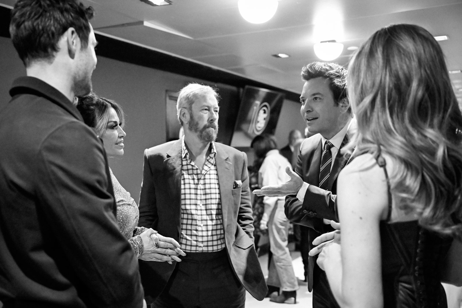 „Jimmy, vrei să o saluți din nou pe Gabby?” comediant Robby Hoffman spune din afara grupului, dornică să obțină un instantaneu mai bun al noii sale mirese îmbrățișându-l pe gazda de noapte. Ca soțul lui Mountbatten James Coyle cercuri cu propria sa cameră de telefon, ruda îndepărtată a Prințul Charles declară: „Ați îmbrățișat pe toată lumea în afară de mine!”