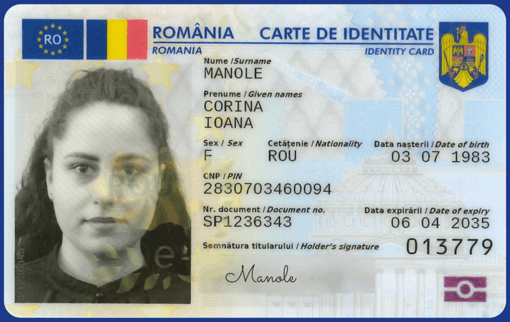 • Informații tipărite: Numele, cetățenia, CNP-ul, fotografia și semnătura titularului.