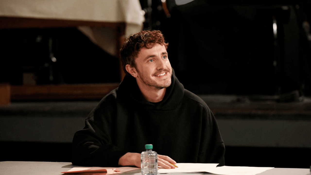 Paul Mescal apoi a urcat pe scenă pentru monologul său purtând cel mai fascinant pulover. Cum să descriu acest obiect d’art? Era negru cu bordură roșie. Un pic alunecos, intoxicant de transparent – un look în același timp conștiincios și pudic și pod și tunel. Ar trebui să o poarte la fiecare petrecere de sărbători.