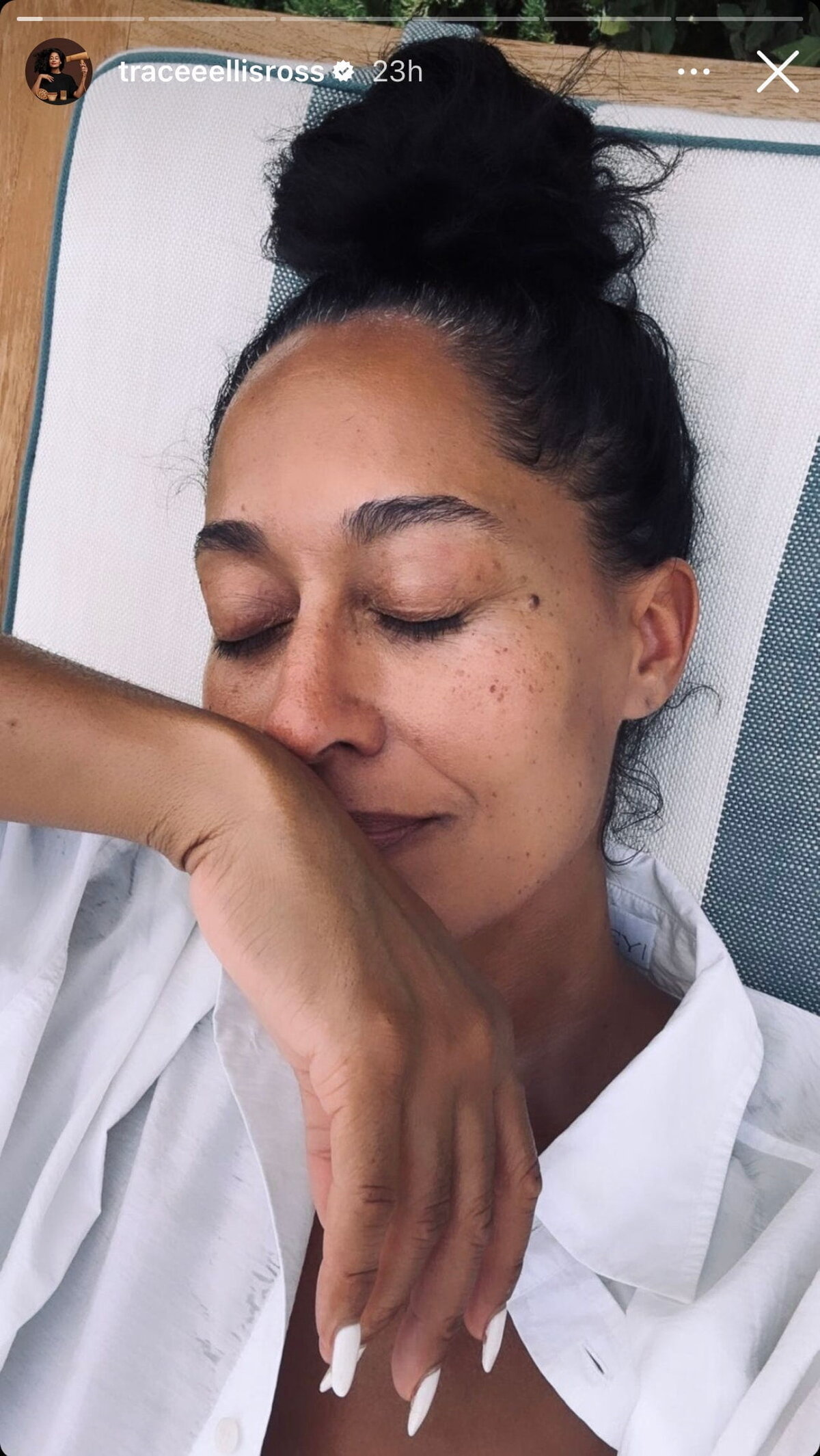 Ea a împărtășit o privire la unghiile ei albe pe Instagram Stories pe 9 iulie. În prima fotografie, Ross părea relaxată, cu ochii închiși, cu capul sprijinit pe un scaun și cu mâna postată pe față. Vârfurile ei lungi păreau la fel de albe ca o cremă grea, asortate cu bluza cu nasturi pe care o purta.